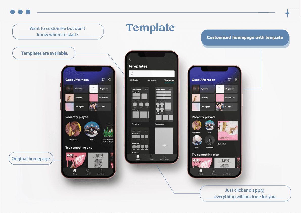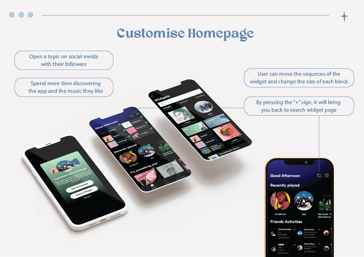 From the reserach ,survey and experiment, we found out that spotify homepage is too overwhelming. Users love things that can be customised, however they prefer features that can let them reach to their playlist/ song/ podcast faster. Users mostly use Spotify when they are taking transportation.